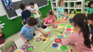 A l’escola, els nens i nenes de I5 continuem treballant inspirats en kandinsky. En aquesta ocasió hem necessitat dues sessions de plàstica. A la primera sessió, hem fet quadrats amb retolador negre i els hem pintat de colors diferents amb plastidecors (colors que solia utilitzar l’artista). A la segona sessió, hem retallat cercles de colors i mides diferents (grans, mitjans i petits) i els hem anat enganxant tot creant cercles concèntrics, sense que es toquin dos colors iguals. Ho han fet genial!