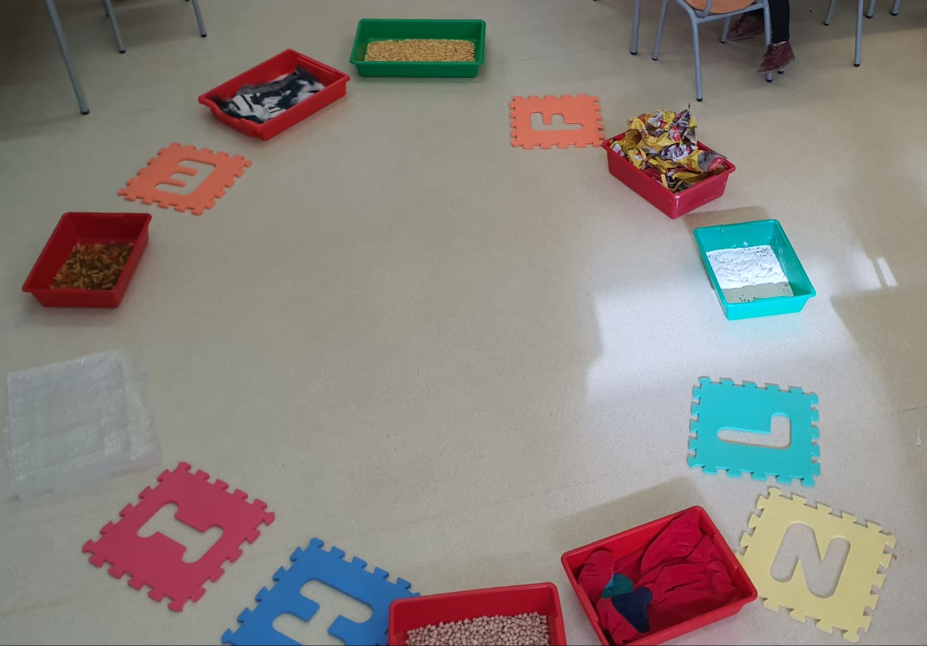 Hui a classe hem provat de caminar sobre diferents textures. Ens em tret les sabates per a caminar sobre un camí sensorial fet amb safates amb material amb diferent textures (macarrons, cigrons, papers, roba suau, roba de pèl, farina, blat de moro, plàstic de bombolles …). Hem notat diferents sensacions a través dels peus, com la diferència entre suau i tou, i n’hem gaudit moltíssim, no volíem que s’acabés la sessió!