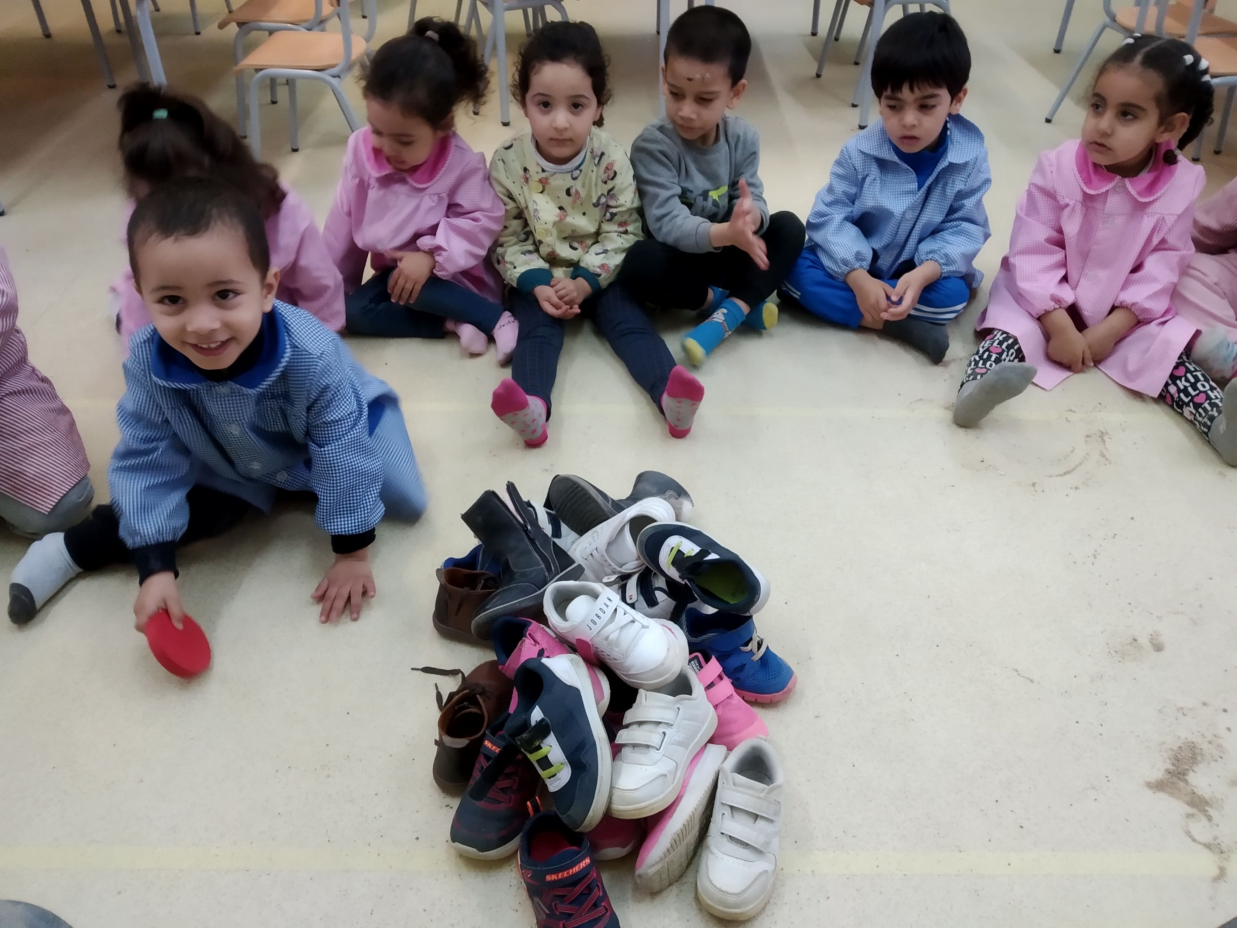 Avui teníem molta sorra a les sabates i hem aprofitat per fer una activitat amb elles. Hem escampat totes les sabates a terra. A la rotllana teníem moltes sabates que havíem d’endreçar. Hem mirat de trobar-ne una que no sigui la pròpia, i l’hem descrit: -té tires de velcro; -té cordons; -és de color blau; -és per a córrer; -és de… i hem buscat la seua parella.