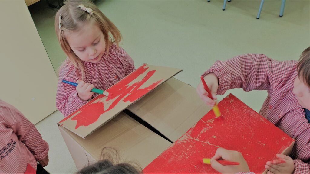 Vet aquí la caixa de la moto que ens van portar els Reis, vet aquí una caseta. Una autèntica transformació! La nostra caseta té dues finestres, una porta i una teulada. La hem creat de manera cooperativa i ens serveix per aprendre tot jugant. Aprenem nocions espaials a partir de les pròpies vivències: dins/fora, davant/darrera, sobre/sota,… us agrada?