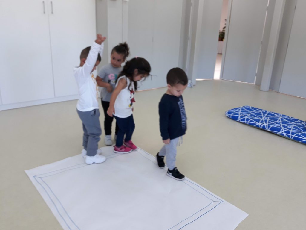 Estem coneixent algunes formes geomètriques: el cercle i el quadrat. Avui hem anat al gimnàs i hem preparat un circuit. Feien equilibris sobre el banc, un salt per baixar, caminaven resseguint un cercle i un quadrat, i per últim rodolaven sobre uns matalassos. Els hem explicat el circuit i hem posat unes fletxes per tal que els nens comencin a planificar la seva pròpia acció. Així doncs, a banda dels objectius matemàtics i de psicomotricitat gruixuda pretenem promoure l’autoregulació.