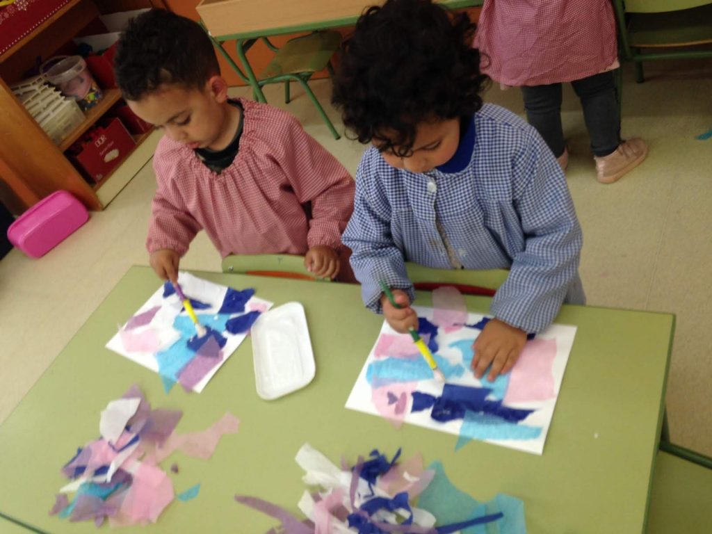 Hem començat un paisatges d’hivern que necessitarà de vàries tècniques. La primera tècnica, per el fons, un cel d’hivern serà el collage. els nens després d’esparracar papers de seda els enganxen amb cola.