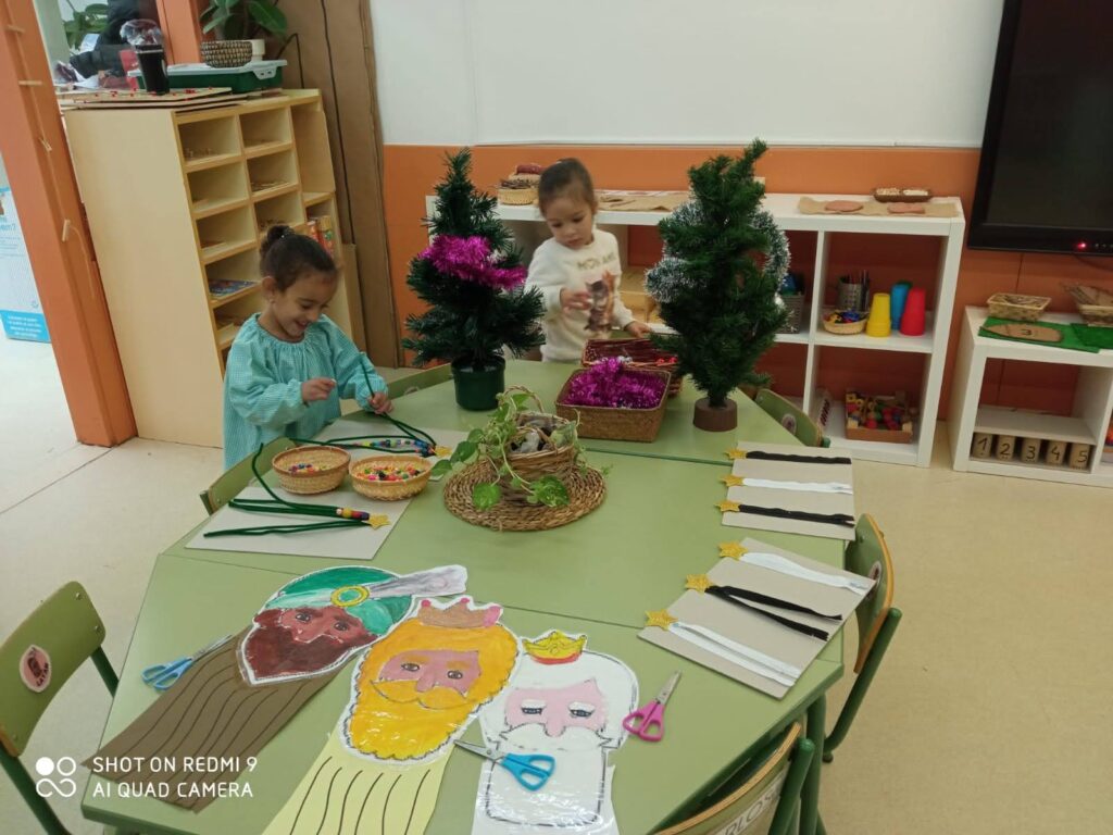 ESPAIS DE PSICOMOTRICITAT FINA:  1. enfilar arbres, 2. tancar i obrir cremalleres 3 tallar barbes dels tres reis. 4, modelar plastilina per decorar imatges de Nadal