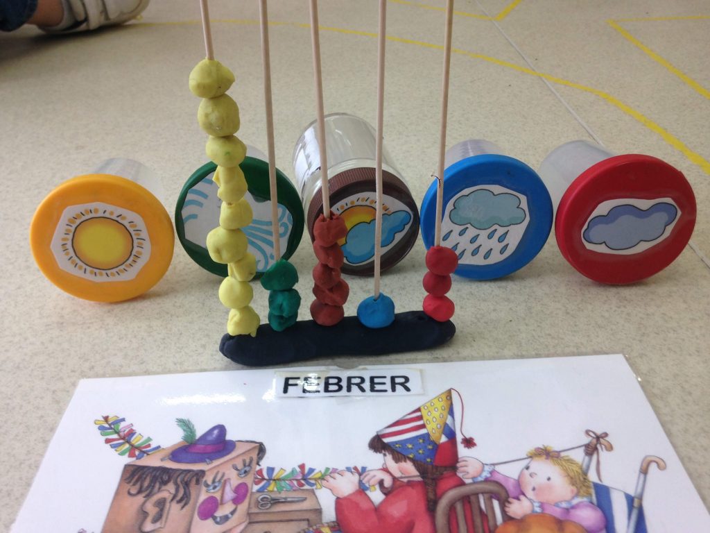 Fa un mes, a p3 hem introduït una nova rutina del temps. Tenim 5 pots que representen 5 fenomens atmosfèrics: sol, núvol, sol i núvol, vent i pluja. cada dia els nens miren el temps i introdueixen una bola de plastilina al pot corresponent i del color corresponent. Avui hem buidat els pots per tal de fer una anàlisi del temps del mes de febrer i hem fet la nostra primera gràfica del temps!! Ja fem estadística!!