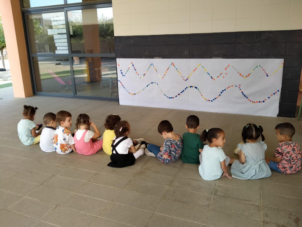 A p3 exercitem el gest gràfic com un acte motriu més. Així treballem el moviment manual a través de moviments vivenciats. en aquesta ocasió hem fet unes línies corbes que els nens i nenes han resseguit amb els seus dits i després han omplert de gomets. No us perdeu les fotos dels procés