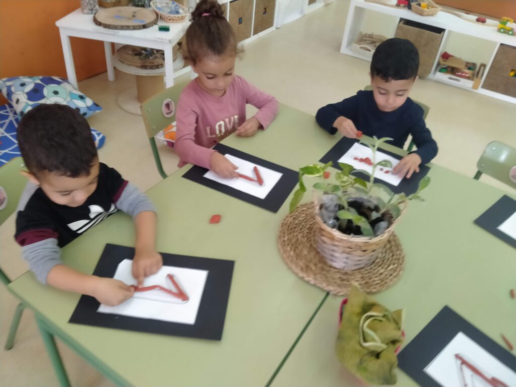 A P3 ens iniciem en la grafia de l’1. La setmana passada el vam descobrim amb tot el cos. Aquesta setmana el descobrim amb els dits. Resseguim, el modelem, el tracem. Hem acabat la sessió fent comptatge d’elements.