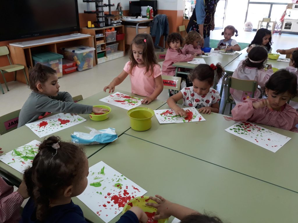 Avui hem tingut el nostre primer contacte, tots junts, amb la pintura. Hem triat el color vermell i el verd i com a eina de pintar, els nostres dits. La premisa és. “pinta amb els dits”. Els nens han descobert el seu tacte, han limitat el contacte de la pintura amb els dits, han pintat dins una superfície concreta, i ho han fet fins que ho han volgut, i després ho s’han netejat ells mateixos les mans, han recollit i rentat la taula i les cadires.