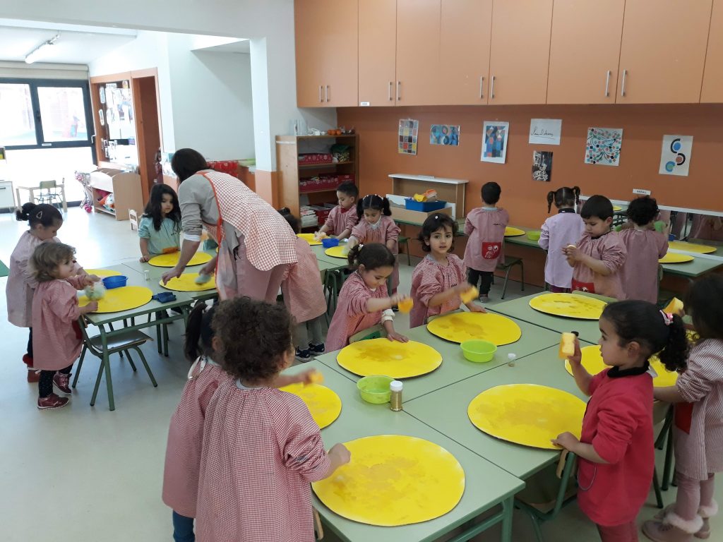 P3 continua fent la disfressa de carnaval. vam pintar de groc aquests cercle tant grans. Avui hi hem afegit daurat amb esponges i purpurina. El nostre cercle ja brilla… encara no sabeu de què anirem?
