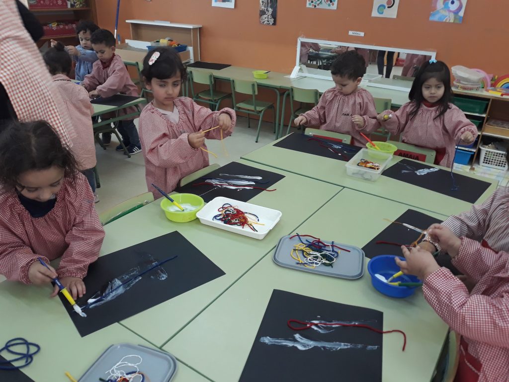 Avui a l’aula de P3 hem interpretat una de les obres de Sonia Delaunay, l’artista que treballem dins el projecte de Somart. HO hem fet enganxant fils de colors en un llenç negre.