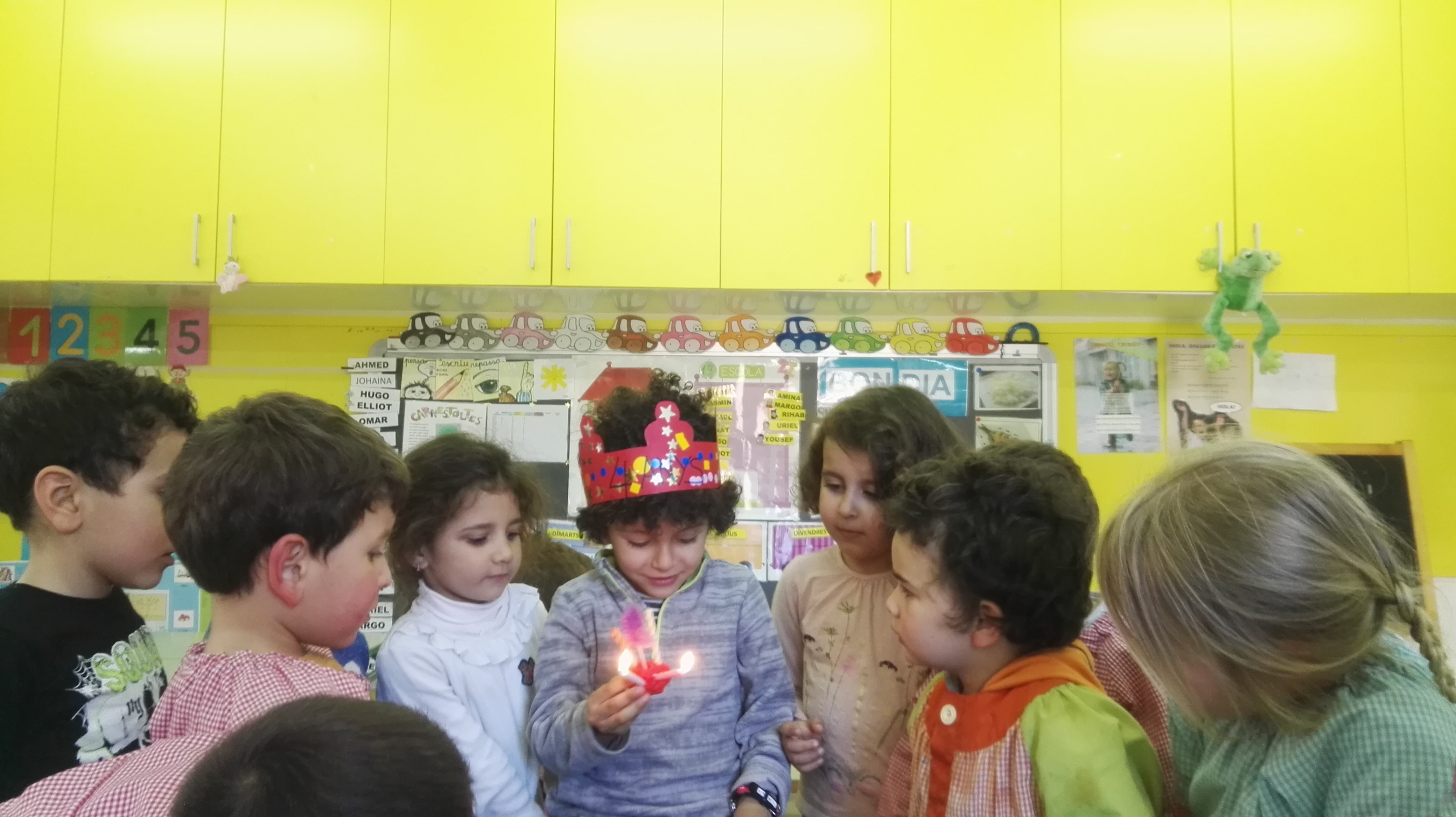Corona que li van fer entre tots els companys, jocs, cançons d’aniversari i no van faltar les espelmes. Estava molt content. A més a més va portar un petit obsequi pels seus companys i és que als més petits els agrada compartir un dia tan especial. Ja tens 4 anys Ahmed, moooltes felicitats!