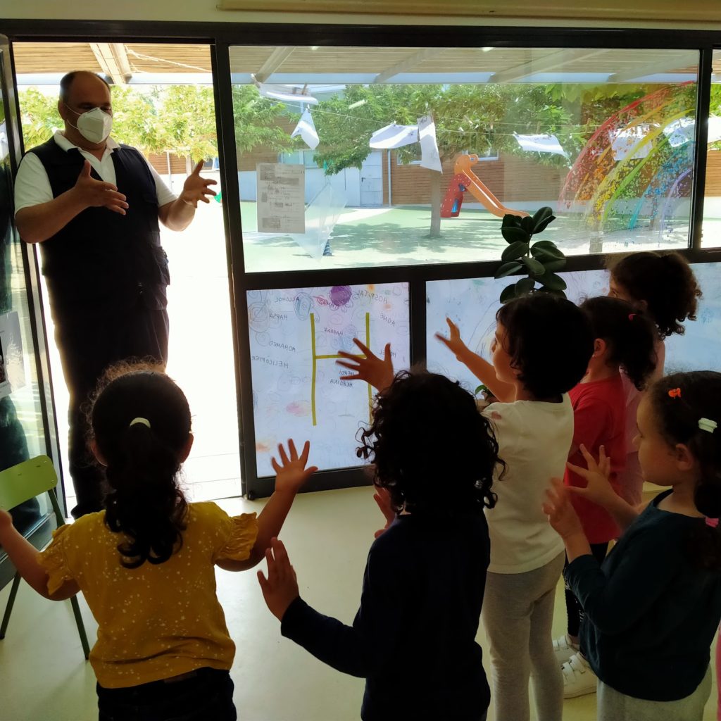 L’artista que estem treballant, la Judith Scoot ens ha fet adonar que hi ha persones que no poden parlar per a comunicar-se i han de buscar altres maneres per a fer-ho. UNa és l’art: la música, la dansa, la pintura, l’escultura…. Hem descobert que hi ha un llenguatge amb les mans. El llenguatge de signes que normalment l’utilitzen les persones amb sordesa. En Dani el nostre conserge ens ha ensenyat a fer els dies de la setmana. També hem buscat paraules boniques per a dir-les amb les mans.