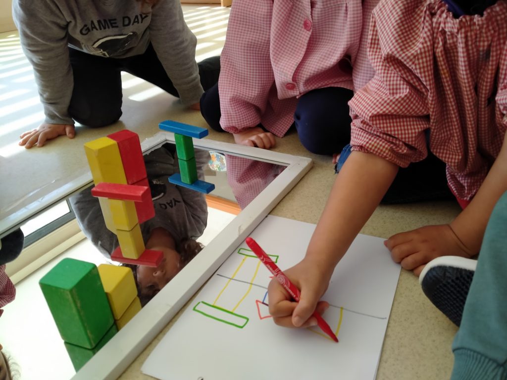 P4 el mirall, eix de simetria Escola26/03/21 Fotos El mirall gran ens ajuda a veure l’eix de simetria, a banda de ser molt xuli!