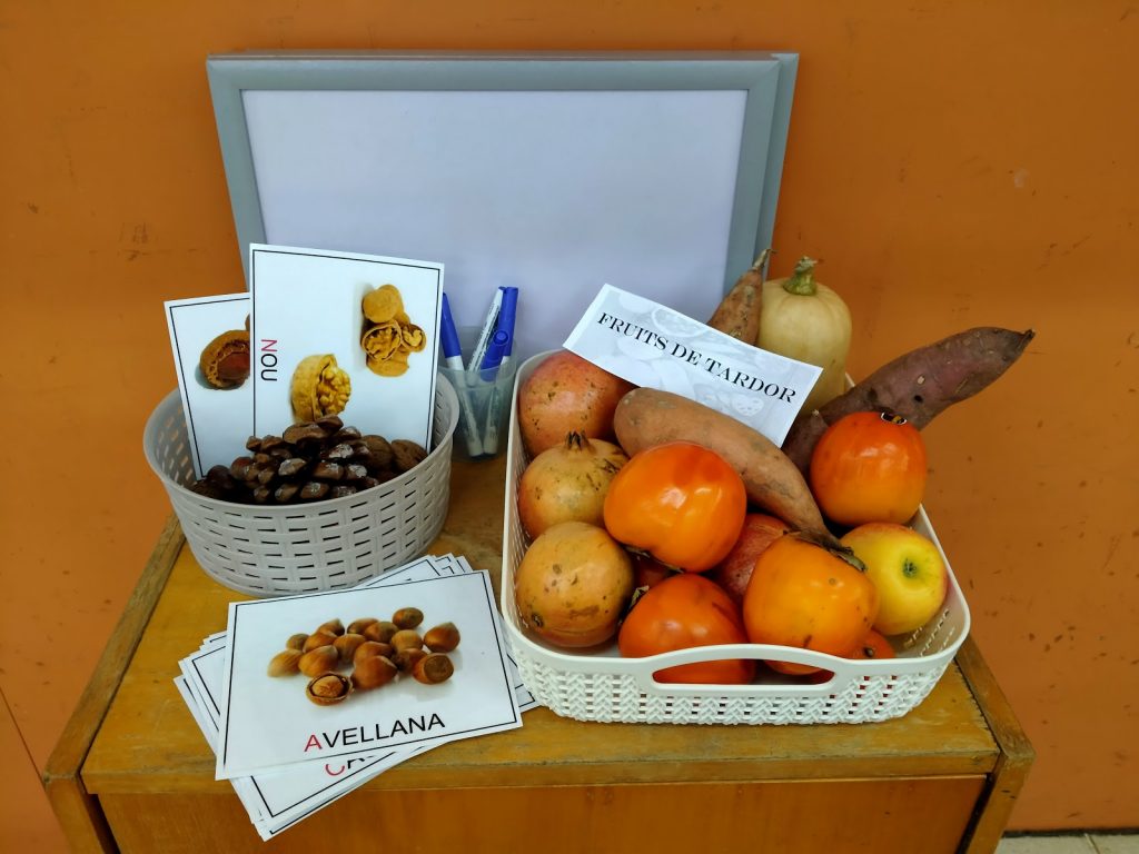 El pas del temps és un dels nostres temes preferits. A la tardor cauen fulles però també ens regala fruits. I per conèixer els fruits de tardor, hem creat el nostre raconet de la tardor. Els nens i les nenes han portat diferents fruits. així ens hem pogut manipular, explicar, anomenar, observar, comparar… ho he aprofitat també per comptar, per mirar mides (gran, mitjà i petit). A més els deixem a l’aula per tal que els nens els puguin seguir manipulant, observant, comparant… També els hem repartit algunes de les fruites que heu portat en safates individuals per a poder experimentar amb els cinc sentit. L’aula s’ha quedat en silenci absolut quan els nens i les nenes anaven desgranant la magrana, psicomotricitat fina i a més activitat relaxant! Després s’han anat activant tocant, olorant i provant les fruites. Gràcies famílies per la vostra col·laboració! Sense vosaltres no hagués estat possible…