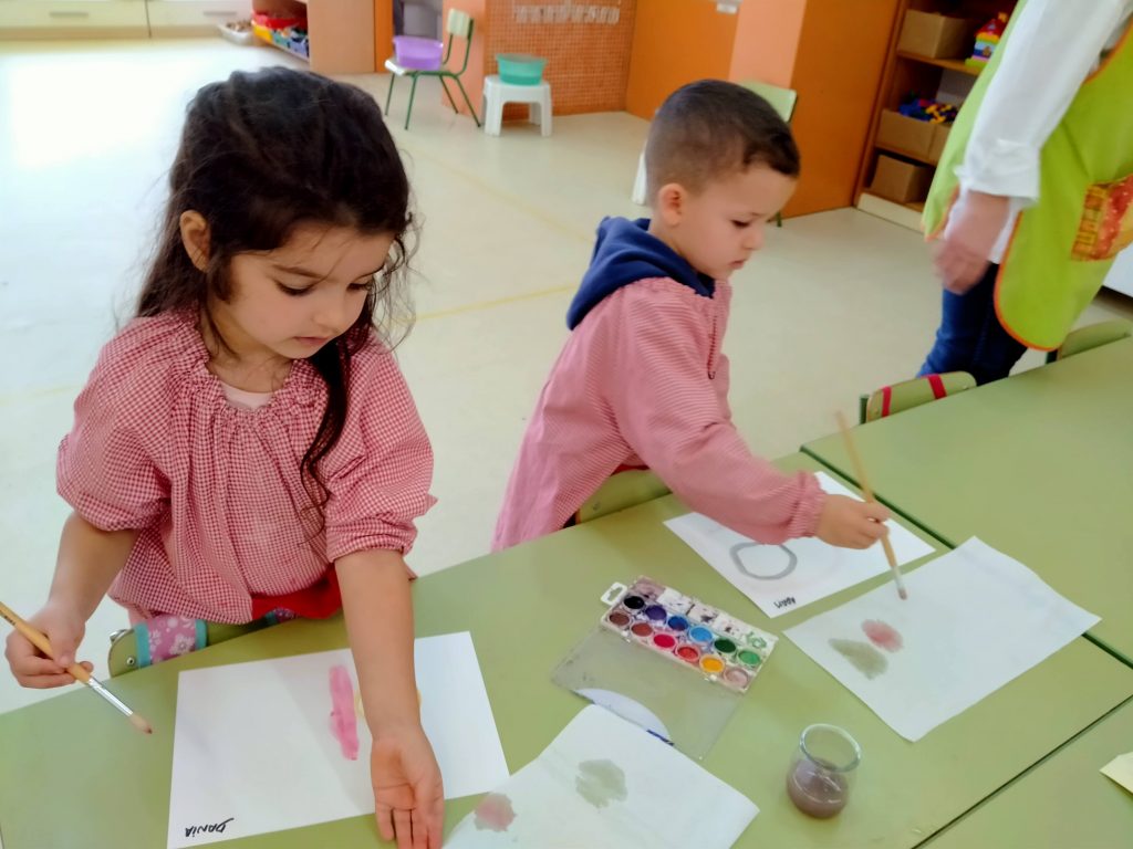 Ens hem estrenat amb l’ús de les aquarel·les. cal conèixer la tècnica per a poder-les utilitzar, ja que cal diluir-la amb aigua per tal que doni color al paper. Els nens i les nenes han après a pintar amb les aquarel·les així com també com canviar de color, canviar l’aigua quan és bruta… Han pintat lliurement amb l’objectiu d’experimentar lliurement amb aquest tipus de pintura i la nova tècnica. I amés, han sortit uns obres d’art!
