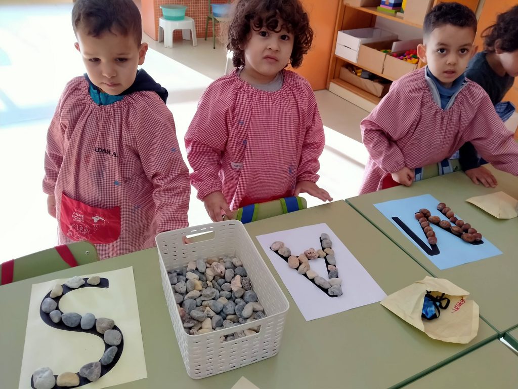 Aquestes setmanes hem començat a fer diferents propostes a la vegada per tal que els nens vagin fent lliurement una i altra proposta. Hem fet propostes interioritzar les grafies que ja hem anat treballant (S,M, A). Hem aprofitat elements naturals que tenim a l’aula: pedres, curculles, castanyes, avellanes, ametlles per tal que el nen pogués confegir la lletra. També hem ofert plastilina per tal de modelar la grafia. La següent proposta era representar les grafies sobre la sorra.