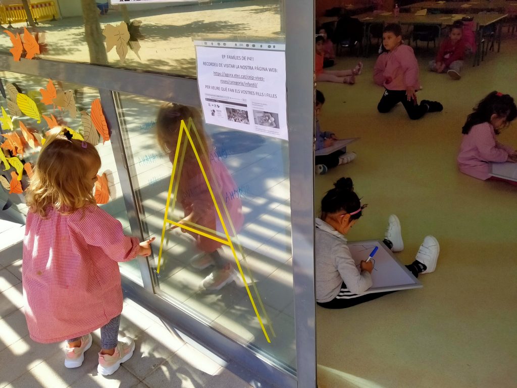A P4 comencem una activitat que durarà molt: la inicial del meu nom.  En aquesta ocasió una inicial que es repeteix molt a la classe és la A. És la inicial de L’Adara, l’Adam, l’Amaia, l’Alejandra. I els nens i les nenes de P4 anem pensant, dient, fent llistes de paraules que comencen o tenen la A.  Així doncs, principalment ho treballem a través de la consciència fonològica, però també aprofitem per a presentar  la seva grafia, tant el reconeixement com la representació. La resseguim, hi caminem per sobre, la fem a la sorra del pati, l’escrivim en pissarretes, la reconeixem dins paraules… A més les famílies ens ajuden a treballar aquesta lletra. Cada dia els nens porten paraules que escrivim al voltant de la nostra “A” gegant. Fantàstic!!