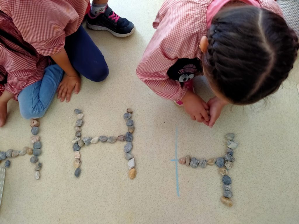 Aquests dies fem la darrera inicial dels noms dels nens i nens de la classe: La H. En català no sona, però en alguns dels noms de la classe si. La diversitat lingüística sempre és riquesa!! Continuem treballant de la mateixa manera: auditivament a través de la consciència fonològica, visualment reconeixent la grafia, propioceptivament, així com reproduir la lletra amb materials, resseguint, escrivint…