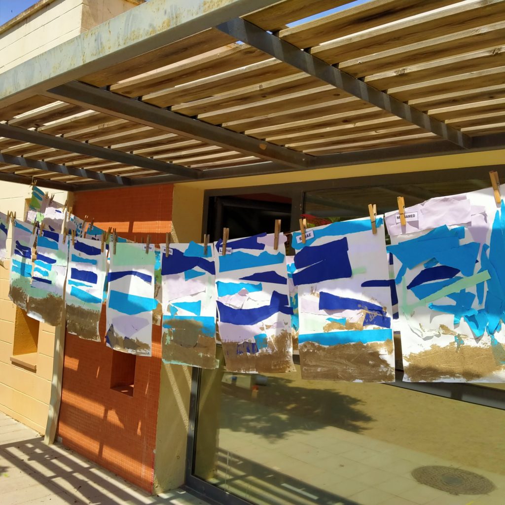 JA arriba l’estiu, i tenim ganes d’anar a la platja. Avui hem creat la nostra platja. Organitzem l’espai en el paper: a dalt del paper, el mar, a baix, la sorra. Posem trossos de paper horitzontals. Estripem papers, els enganxem, i tamisem sorra sobre un llit de cola i tatxan… la nostra platja.