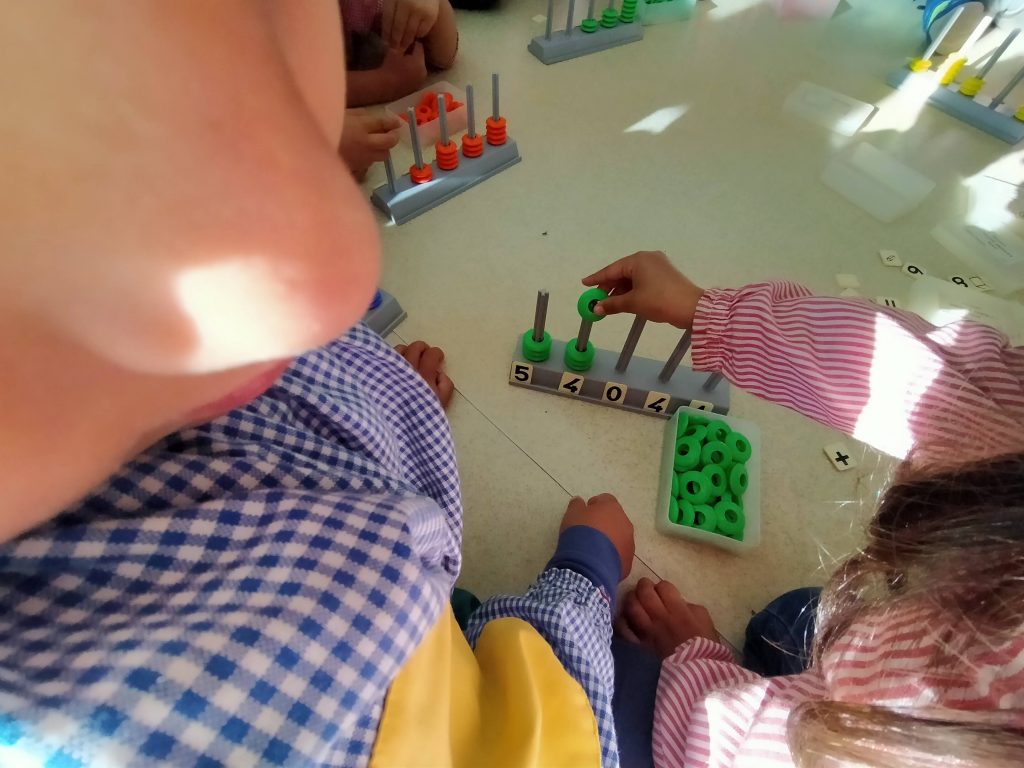 Dins el treball de comptatge i numeració hem presentat aquest material. És una versió d’un àbac, on anem posant números i els nens i les nenes enfilen el número de peces representades al pal. Tot just comencem a conèixer alguna de les grafies del números… Anirem practicant….