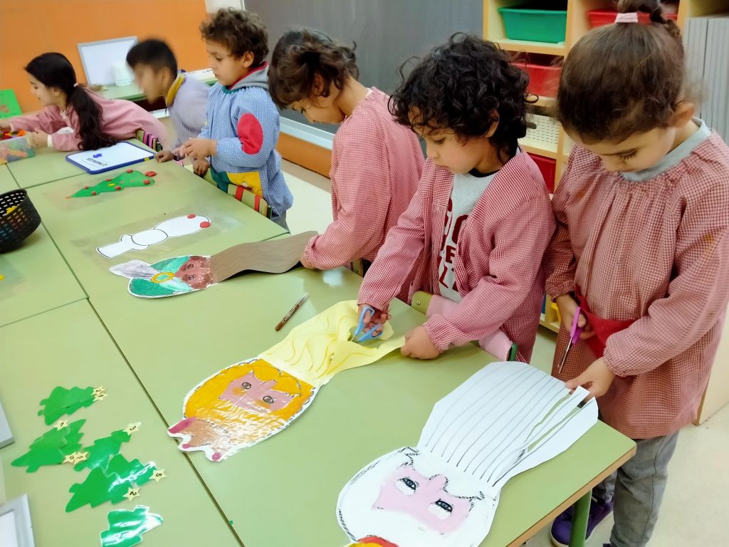 Les propostes matinals de les entrades relaxades d’aquests dies tenen temàtica de Nadal. Així hem combinat activitats més matemàtiques, de llengua, de creativitat, de psicomotricitat fina, de peces soltes… Cada nen i nena, com cada matí troba aquestes propostes per les diferents taules. Després de saludar els seus amics i amigues i endreçar les seves coses, vam per la classe fent la proposta que els ve de gust. La única condició és que hi càpiguen en l’activitat. No importa si la repeteixen o no les fan totes. Així dons aquesta setmana podien: tallar les barbes dels reis, dissenyar i modelar les parts d’un ninot de neu amb plastilina (nas, ulls, bufanda, braços…) i d’un arbre de Nadal (boles, campanes, guirlandes…), confegir paraules de Nadal seguint un model, posar tantes boles com número indica en un arbre de Nadal (amb pincetes), fer mandales amb peces soltes de la natura, comptar i trobar el número de pares Noel que hi ha, mirar contes de Nadal, Decorar arbres de Nadal de gespa amb botons i escura-pipes, posar follets en el trineu segons el número….