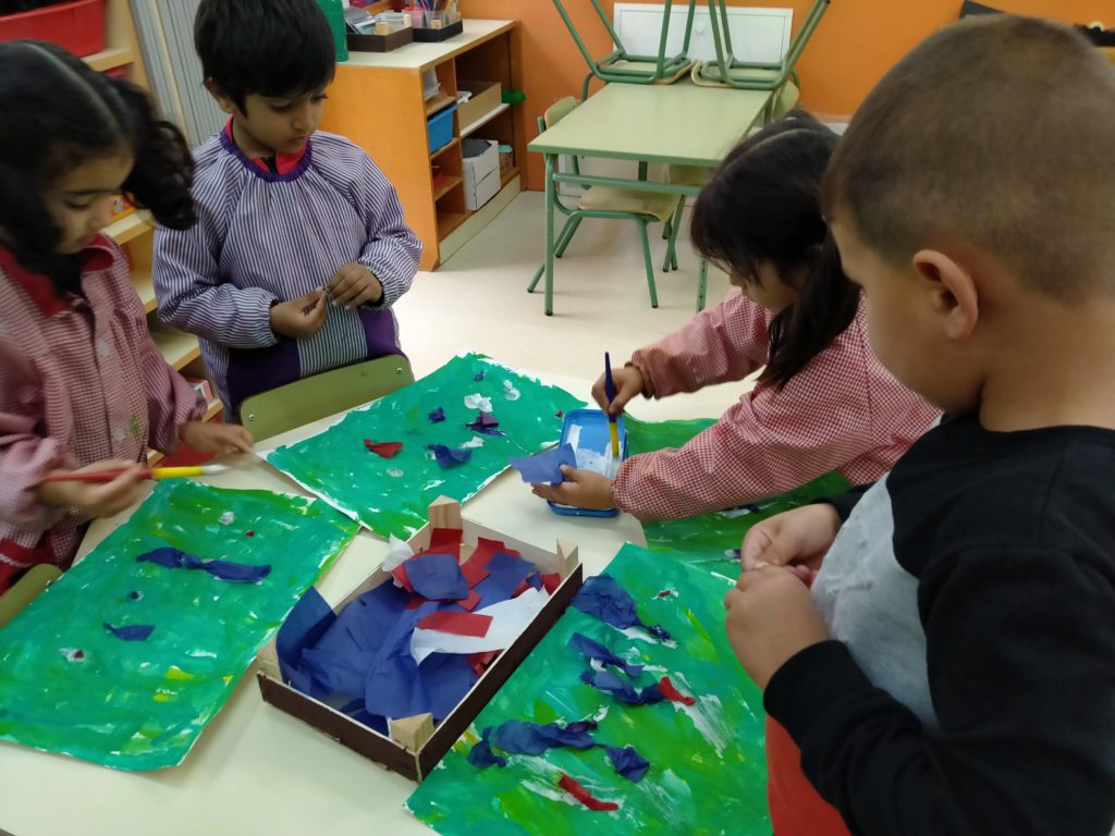 “El lliris” de Vincent van Gogh ha inspirat a P4 en aquesta producció. Pintem amb pinzellades de verds, grocs, blancs fent les tiges i fulles dels lliris. Amb paper de seda creen les flors dels quadres: roselles vermelles, i lliris blaus… i les enganxen inspirats en el camp de flors del quadre de l’artista. Fantàstics aquests quadres!