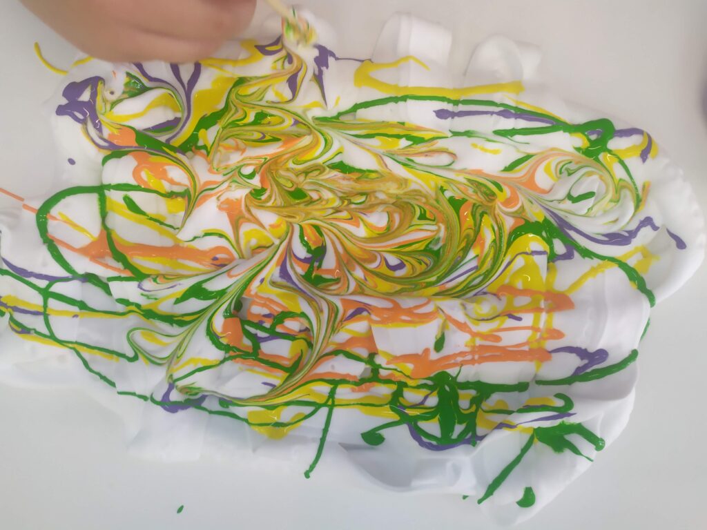 Per la sessió d’experimentació de dilluns vam utilitzar escuma d’afaitar, pintures, un bastonet i un full. Vam començar posant força escuma d’afaitar i seguidament hi vam posar rajolins de pintura. Amb un bastonet (tipus pinxo) vam escampar la pintura tot fent traços. Llavors vam posar un full a sobre de tota la barreja tot apretant-lo una mica. Vam deixar passar un minutet i vam aixecar el full. Després vam gaudir d’enfonsar les mans a l’escuma, ens vam fregar l’escuma per les mans, vam escampar l’escuma sobre el paper i vam descobrir que hi podíem escriure, dibuixar … Una sessió molt divertida !!!!
