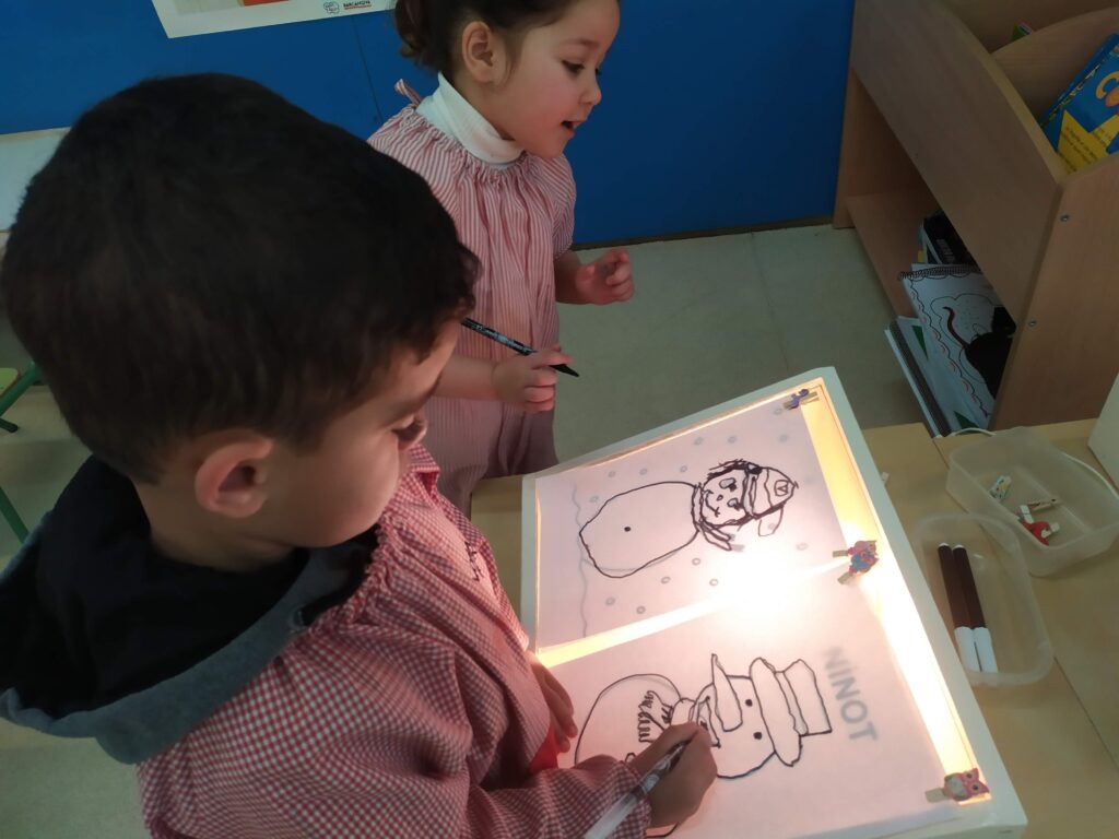 - Ús de la taula de llum per omplir pots numèrics amb pompons segons el color que indica la tapa del pot i el nombre triat.