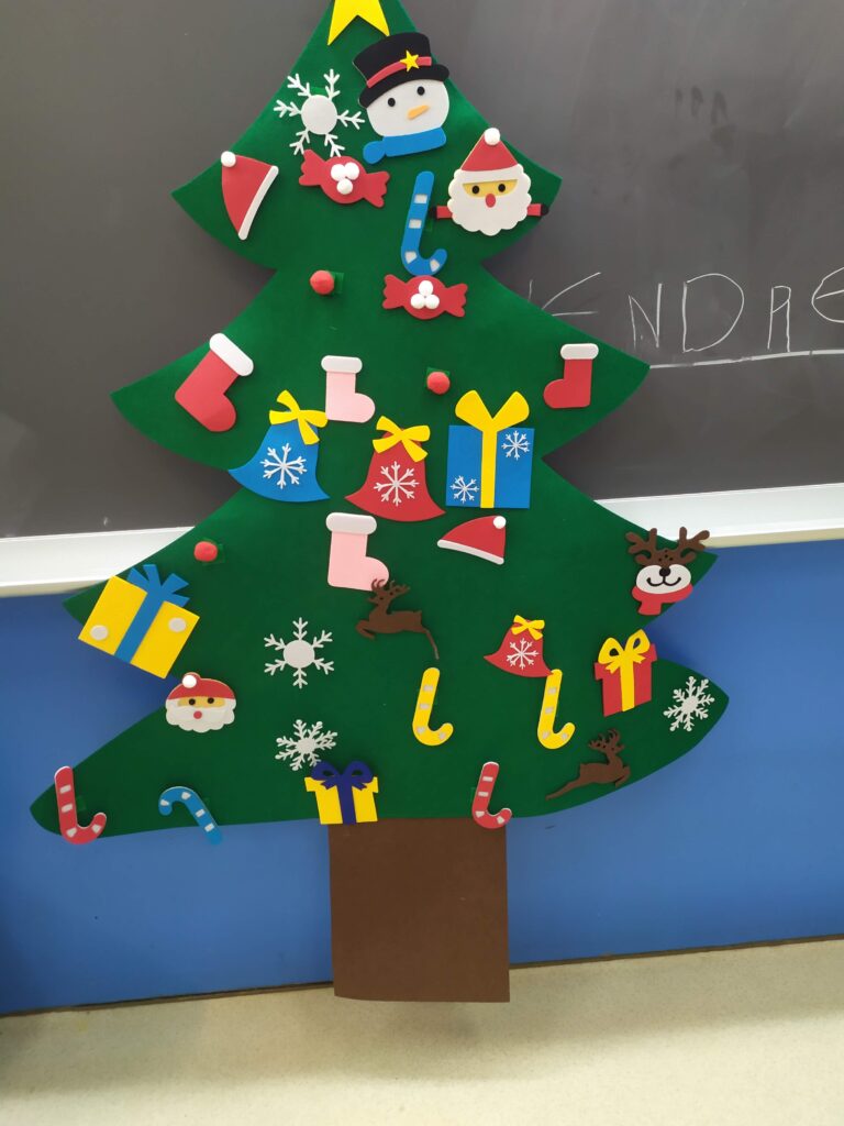 1. Decorem conjuntament un arbre de feltre amb diferents elements i reforcem el vocabulari nadalenc: ren, bastó, pare Noel, regal, campana, floc de neu, bota, gorro, estrella …