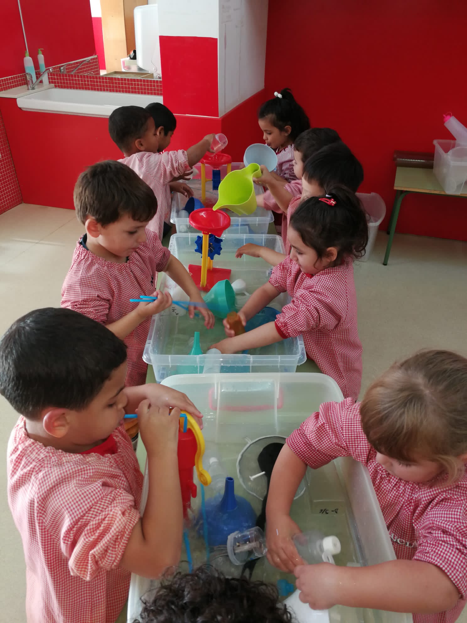 Sovint quan som dues mestres a l’aula aprofitem per fer una atenció més individualitzada i realitzar activitats en petit grup. Aquestes fotos són una mostra de com podem, en una tarda, fer dues tasques tan diferents: experimentar amb aigua i dibuixar una castanyera fent traços i acolorint.
