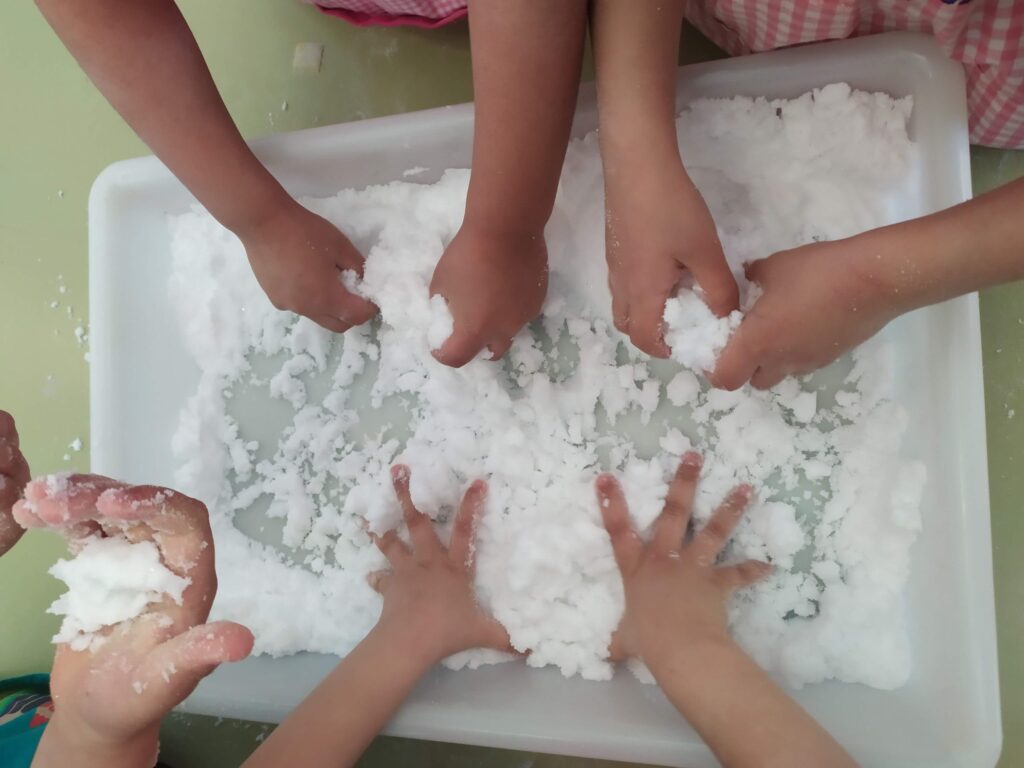 Amb bicarbonat i aigua hem aconseguit la textura i consistència de la neu. Hem tocat, remenat, barrejat … També hem jugat tot posant animals que viuen en països freds (pingüins, ossos polars, morses, orques …) i, finalment, hem deixat pas a una experiència molt visual: amb pipetes i colorants hem deixat caure gotes de colors sobre la neu !!