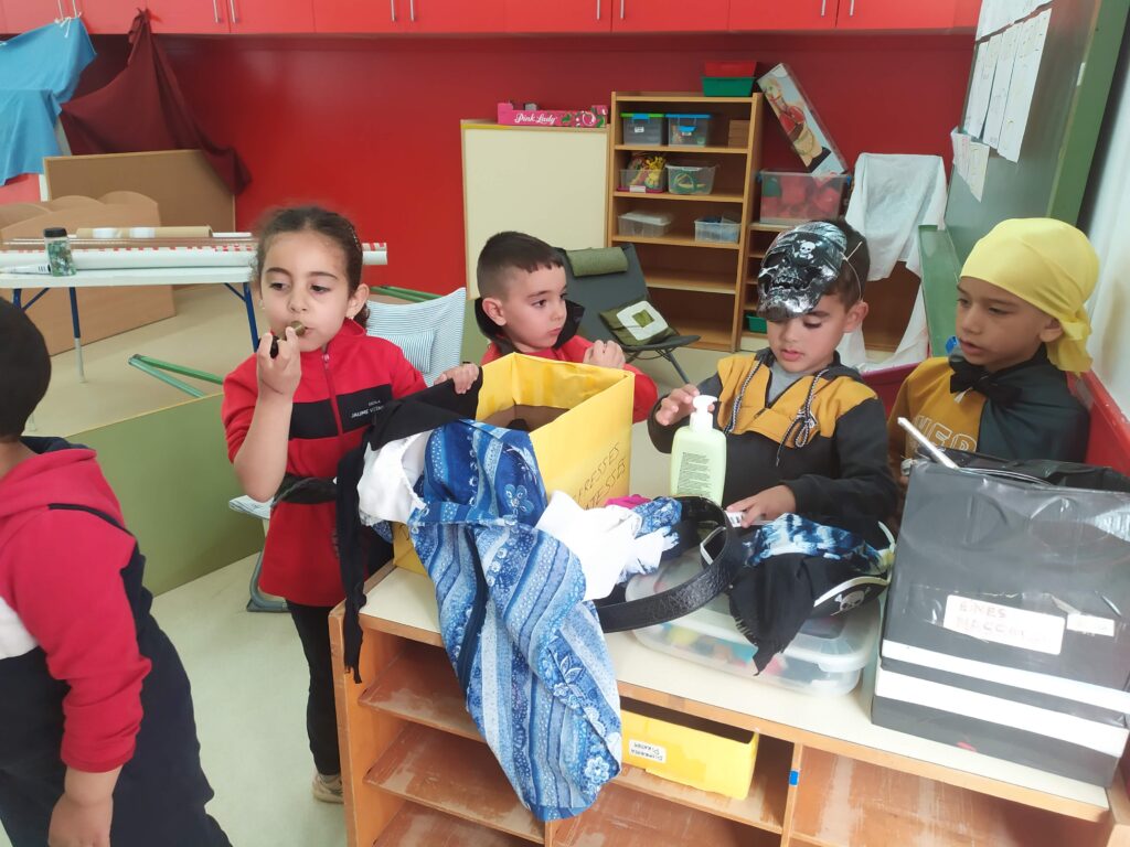 Hem creat molts espais de jocs diversos sense joguines. Els i les alumnes, en entrar, han d’imaginar-se el joc que hi volen practicar i aleshores enriqueixen l’ambient amb elements diferents. S’han disposat materials de rebuig o poc convencionals per tal d’afavorir la investigació creativa a mida que es va descobrint l’entorn.
