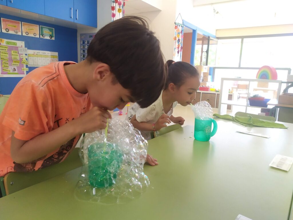 Vam començar fent bombolles amb aigua, sabó i una palleta. Els beneficis d’aquesta activitat són: