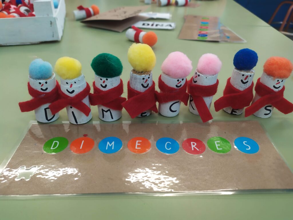 - Confegir els dies de la setmana usant uns divertits ninots de neu amb lletres. Aprofitem per incidir en el reconeixement de les lletres, l’ordre dins la paraula, els sons …,