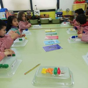 En aquesta sessió, entrenem el càlcul visual amb un material molt atraient per ells. Són vehicles de diversos colors i formes. Cada nen te el seu Pàrquing (caixa de plàstic reciclada) i han d’anar seguint les consignes ( p.exple: tots n’agafem 2,ara dos més.Quants en tenim? ) Després el dau de colors i de numeració ens indicava què havíem de fer.