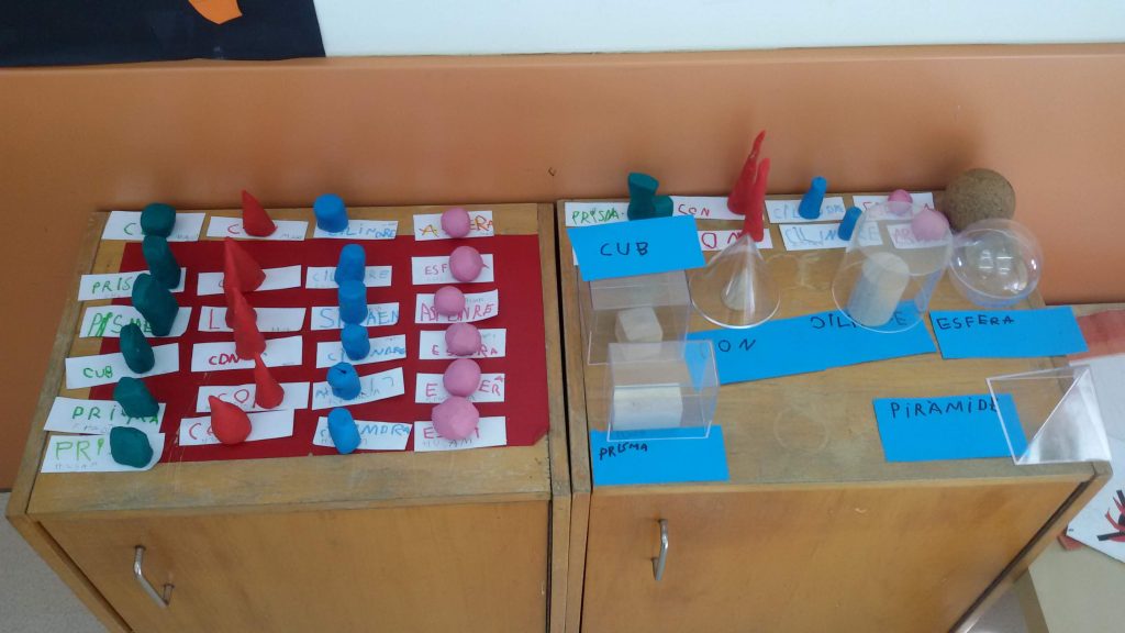 A p5 anem experimentant i descobrint la geometria a l’hora de matemàtiques. Després de conèixer les figueres geomètriques en el pla, ens llancem cap al volum descobrint els cossos geomètrics:  l’esfera, el con, el prisme, el cilindre, el cub, piràmide…