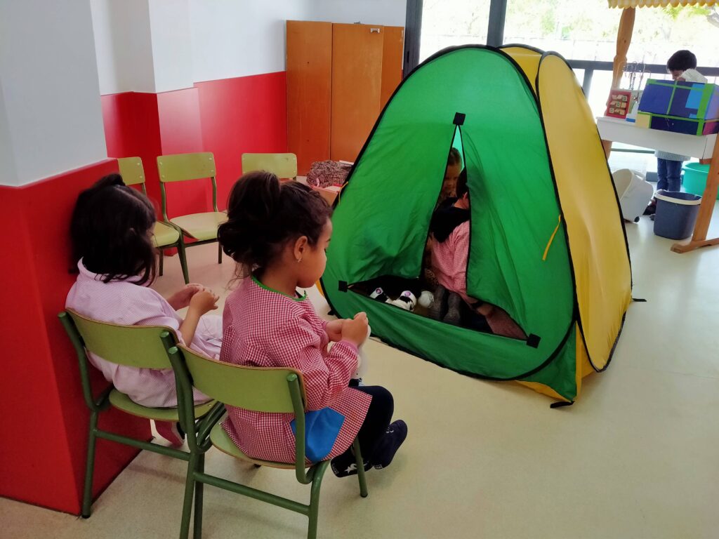 Hem creat molts espais de jocs diversos sense joguines. Els i les alumnes, en entrar, han d’imaginar-se el joc que hi volen practicar i aleshores enriqueixen l’ambient amb elements diferents. S’han disposat materials de rebuig o poc convencionals per tal d’afavorir la investigació creativa a mida que es va descobrint l’entorn. (Sílvia Sala)