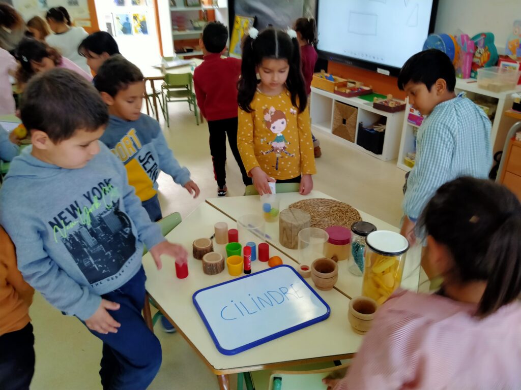 A p5, en les sessions de matemàtiques descobrim els cossos geomètrics dins l’aula. Presentem  els cossos en volum (cilindre, con, prisma, piràmide…) els toquem, els manipulem , parlem de les característiques. I després busquem cossos geomètrics a la vida real, dins l’aula i els classifiquem en taules.