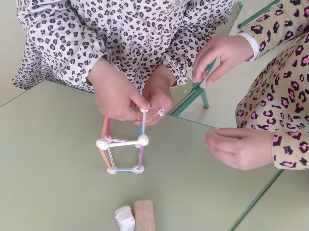 A p5 seguim treballant a les sessions de matemàtiques els cossos geomètrics. En aquesta ocasió analitzem els prismes de base quadrada. Després oferim canyetes i plastilina als nens i nenes per tal que puguin construir el seu propi prisma. Després analitzem quants vèrtex té i quantes arestes té.