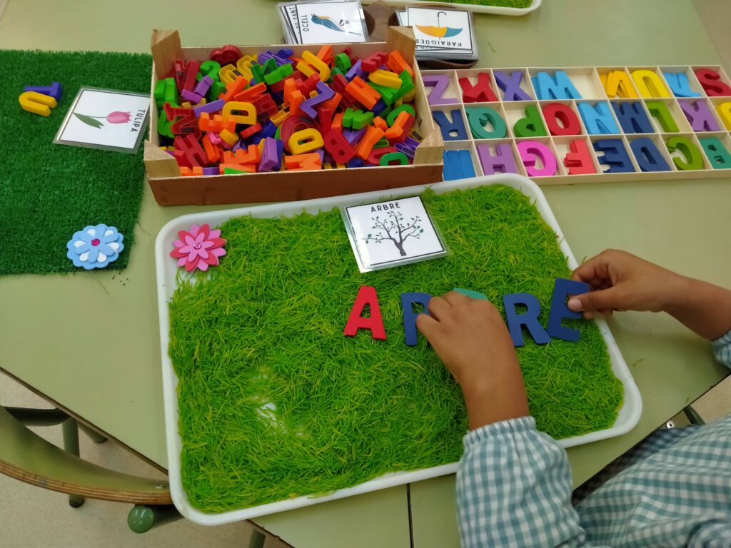 • Traç de tot l’abecedari: resseguint amb pal, confegint la lletres amb peces de colors, pintant amb aigua.