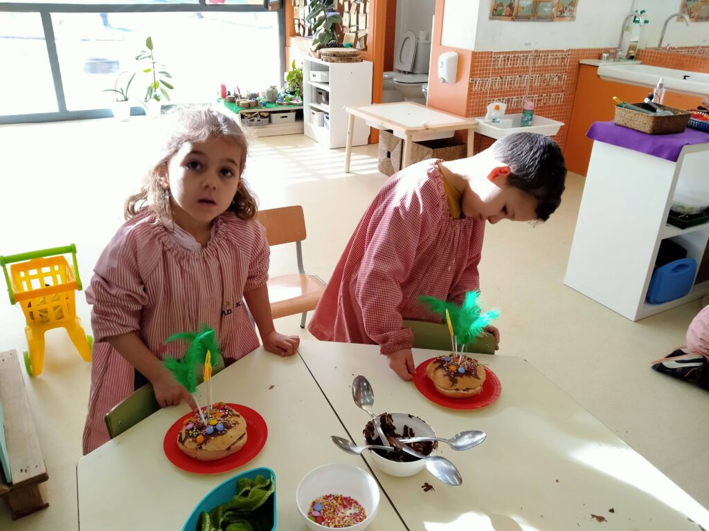 A p5, juntament amb tot infantil avui hem seguit amb la tradició de fer la mona de Pasqua: panet de xocolata, encenalls, plomes i pollets. MMMM!!!