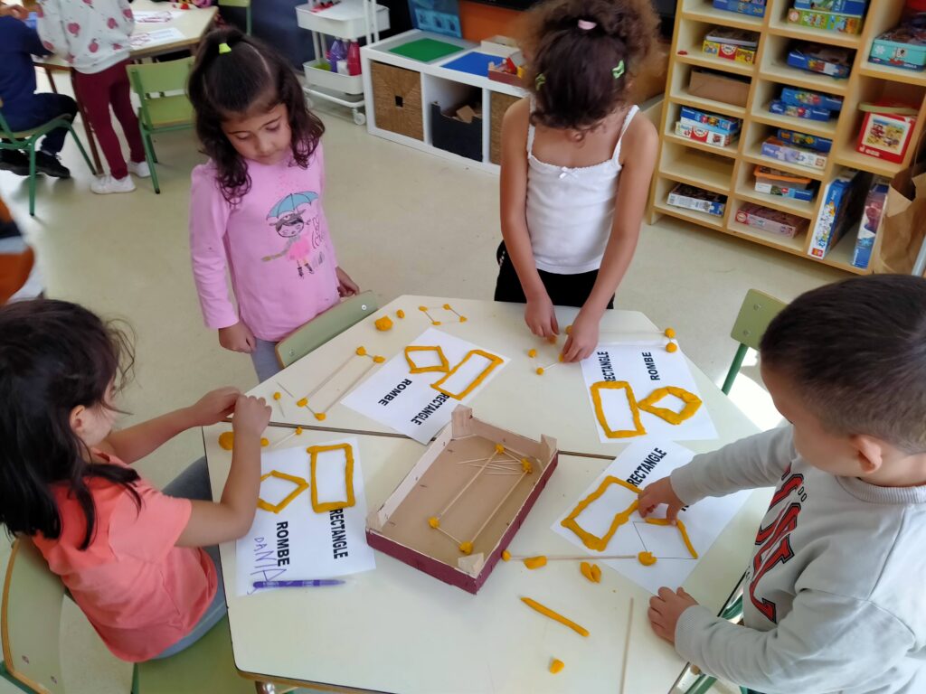 A P5 ja coneixem moltes formes geomètriques i les seves característiques: el cercle, el quadrat, el triangle… Però avui introduïm dues figures geomètriques més: el rombe i el rectangle. Després de caminar sobre les figures, buscar-les per la classe, hem passat a recrear-les amb plastilina.