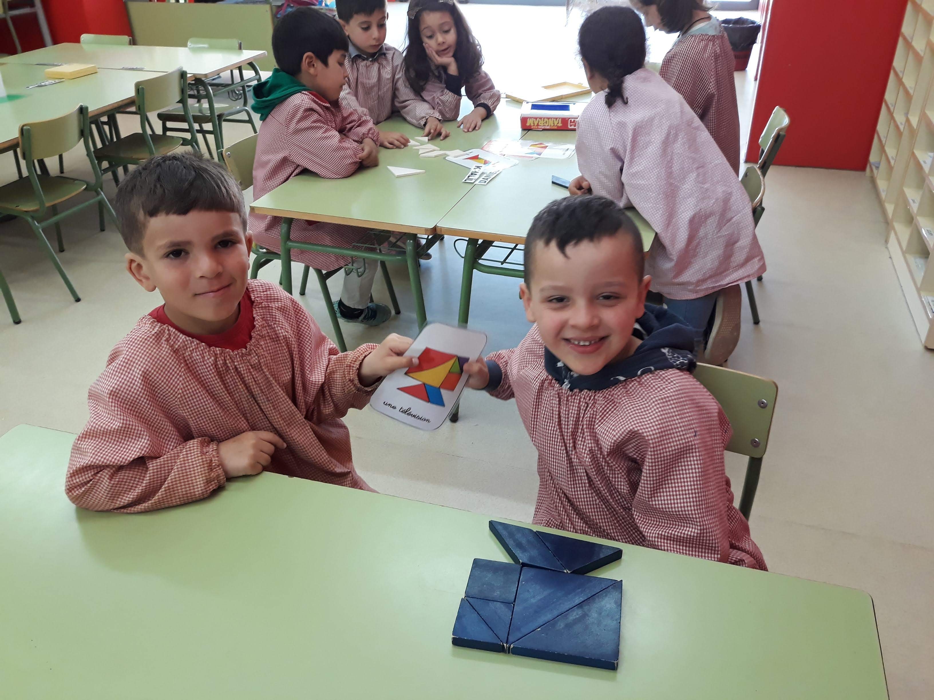 A p5 continuem amb les matemàtiques manipulatives i anem jugant amb el tangram. cada dia fem formes més complicades. Treballem en parelles, en petit grup…