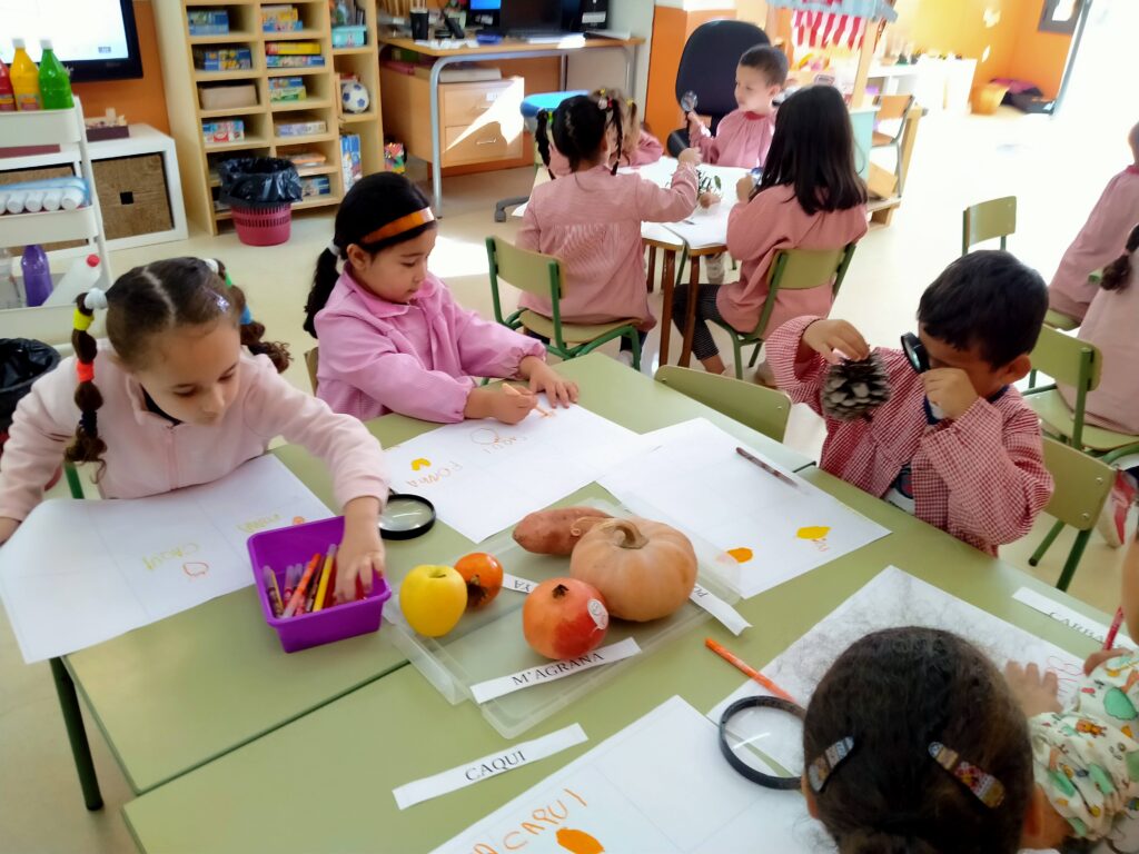 Les famílies de P5, com sempre heu respost de matrícula d’honor a les demandes de l’escola. LA classe era plena dels fruits de tardor que han anat portant els nens i les nenes. Avui han estat objecte d’una observació més sistemàtica i acurada. Per taules han observat els colors, les formes, s’han ajudat de les lupes. I després han plasmat allò que han vist en un full en blanc. El dibuix, amb els colors i les formes que han observat. I a més els que han volgut també han escrit els noms dels fruits que dibuixaven.