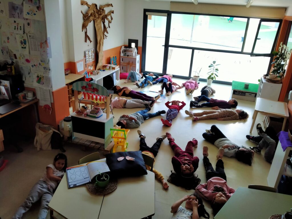 A p5 dins el programa d’educació emocional de Me&emotion seguim explorant les emocions. El drac crack ha de recuperar els seus colors i per això hem emprès un llarg viatge pels regnes on regeixen diferents emocions. ara som al regne suau on l’emoció que impera és la tristesa, la tristesa en serveix per recollir-nos cap endins per saber allò que hem perdut. Avui després de fer una sessió de visualització corporal i la roda de “com estic” hem dibuixat les coses que ens posen tristos i tristes en unes llàgrimes. Després les hem posat en una caixa. En grup anem treien les llàgrimes per descobrir que posa trist als nens i nenes i què podríem fer per fer treure la tristor cap a fora i ajudar-nos mútuament.