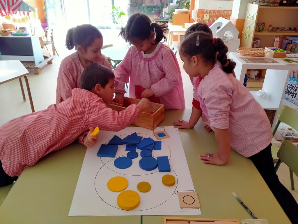 A la sessió de matemàtiques amb mig grup, hem treballat la lògica- matemàtica a través dels blocs lògics que també són un material molt versàtil. LA primera activitat és, donada una targeta amb tres atributs, i ells i elles escollen la figura que defineixen aquells tres atributs. Aquesta activitat l’hem fet a través de les targetes compartides per “gematerol” al pinterest i els blocs lògics de fusta. L’altre activitat consistien en col·locar algunes figures, també dels blocs lògics de fusta, dins els conjunts i la intersecció dels conjunts. Cada conjunta estava etiquetat amb un atribut. Així hem treballat la identificació ( reconeixement d’atributs) i l’agrupació (classificacions i correspondències).