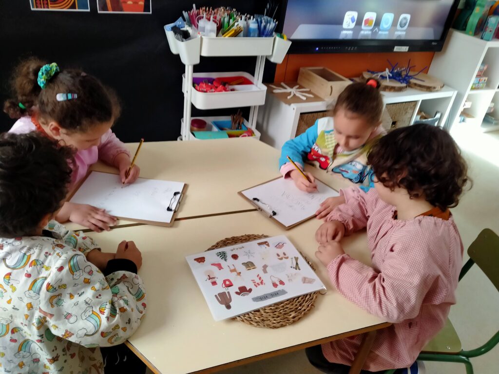 A p5 els nens estan molt interessats en la lectoescriptura amb les paraules d’hivern. He organitzat 4 taules amb quatre activitats. Els nens i les nenes hi han anat passant en grup de manera rotacional: