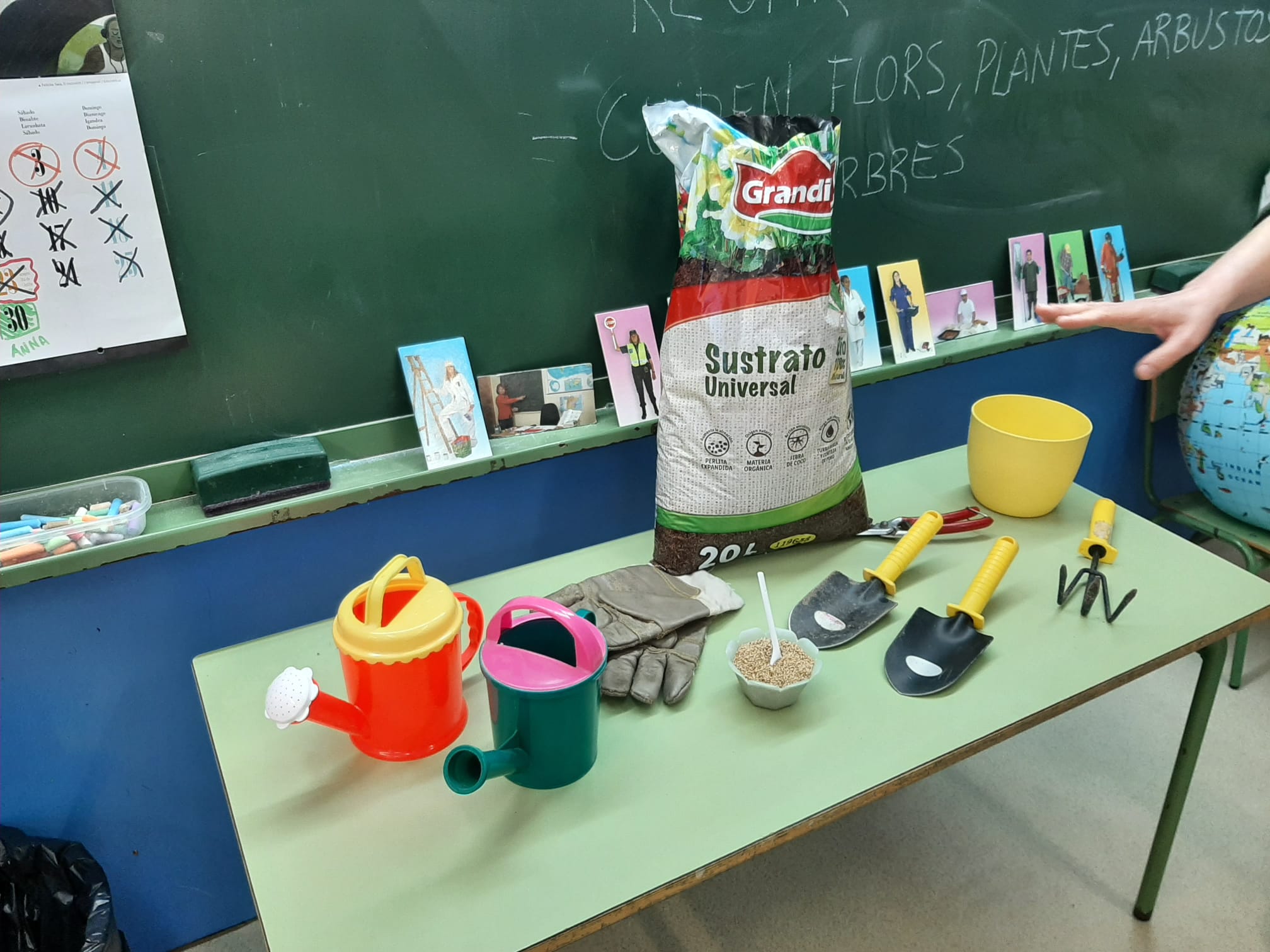 Com ja sabeu A P5 hem iniciat el projecte dels oficis. Avui hem pensat com s’escriu la paraula JARDINER entre tots i també quines tasques fan els jardiners i les jardineres. Hem mirat algunes eines: els guants de protecció, les tisores de podar, la pala, la regadora, el rasclinet i hem decidit que teníem moltes ganes de fer de jardiners a la classe. Així doncs ens hem engrescat i amb terra i aigua hem plantat llavors. Ara toca esperar com germinen les llavors !!