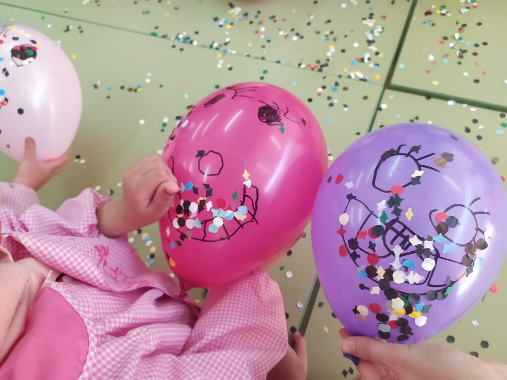 Així doncs vam decidir dibuixar-hi una boca i fregar el globus en els jerseis de llana de les mestres i …. ARA SÍ !! La boca del globus havia quedat ben plena de confeti !!