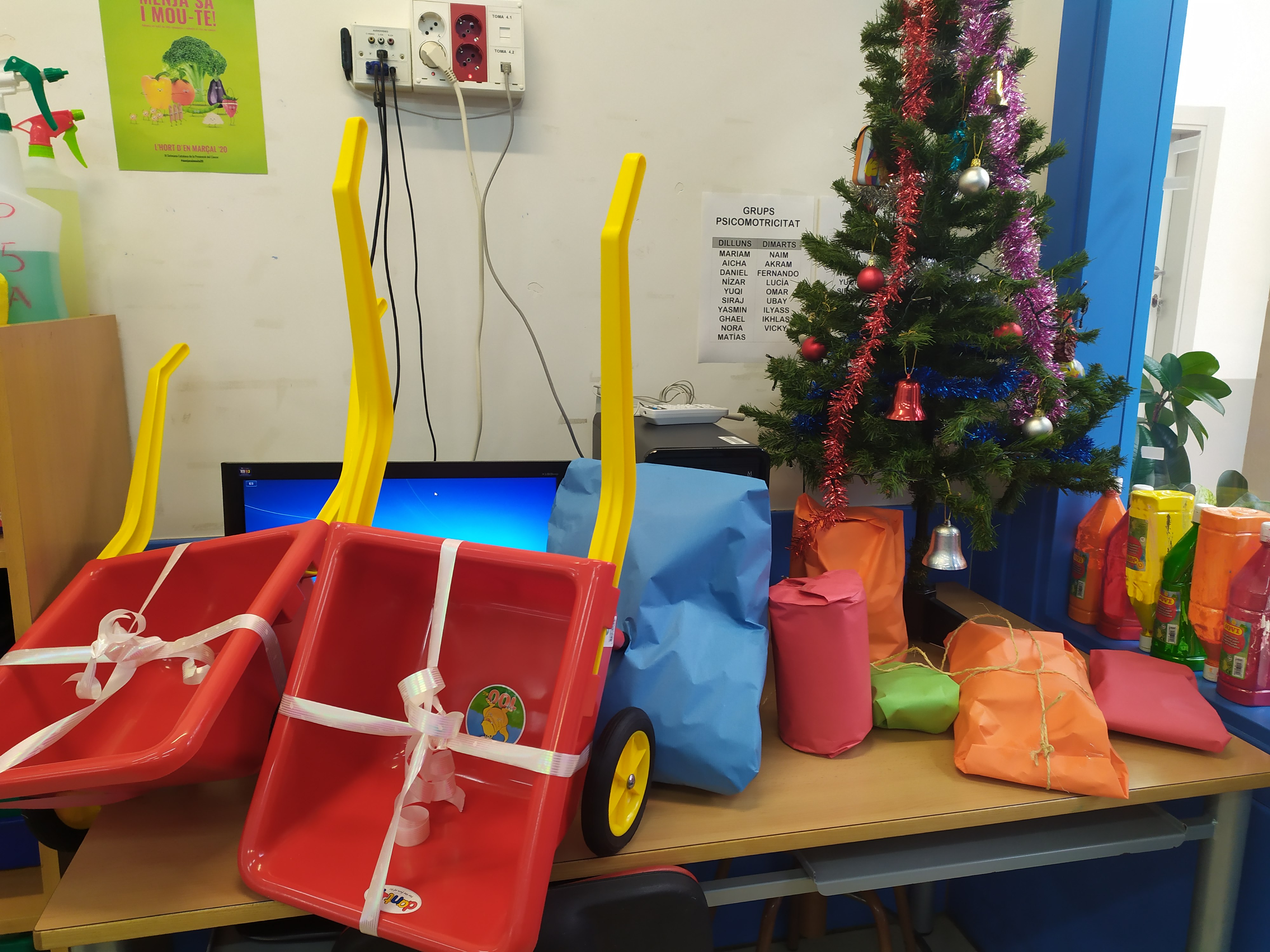 Després de tants dies de vacances i descans ja teníem moltes ganes de tornar a l’escola amb els companys i companyes i amb les mestres per gaudir d’un trimestre ple de noves experiències i aprenentatges. Quan hem arribat…SORPRESA!!!! Els Reis Mags han passat per l’escola i ens han deixat uns regals per la classe: construccions, boles per enfilar collarets, carretons, pales i galledes per jugar al pati !!