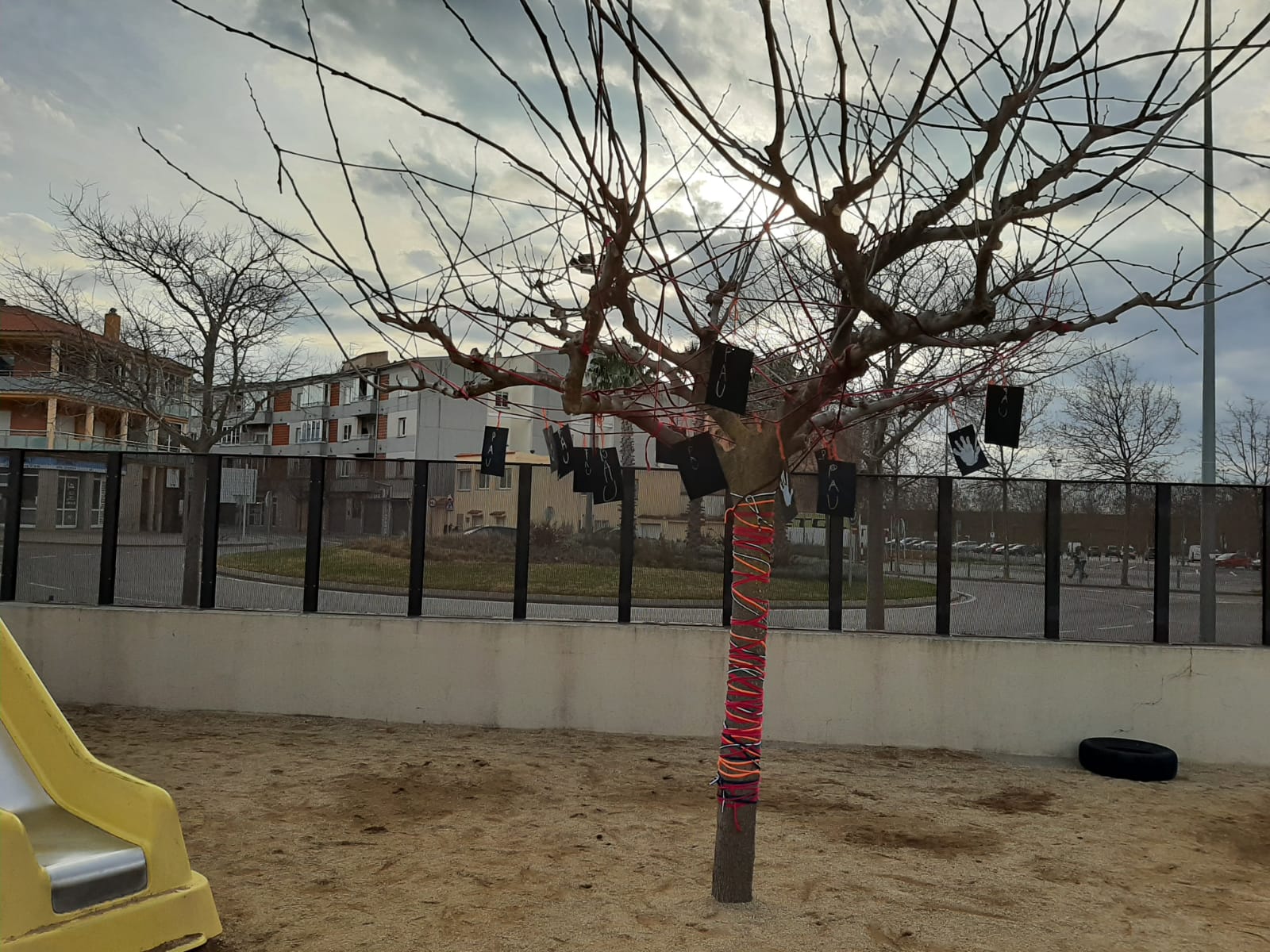 Avui hem aprofitat per fer una activitat de dinàmica de grup i tanmateix decorar els arbres del nostre pati. Ens hem anat passant el cabdell de drapet tot cridant paraules de PAU. I així, entre tots, hem anat guarnint de colors els arbres del pati.